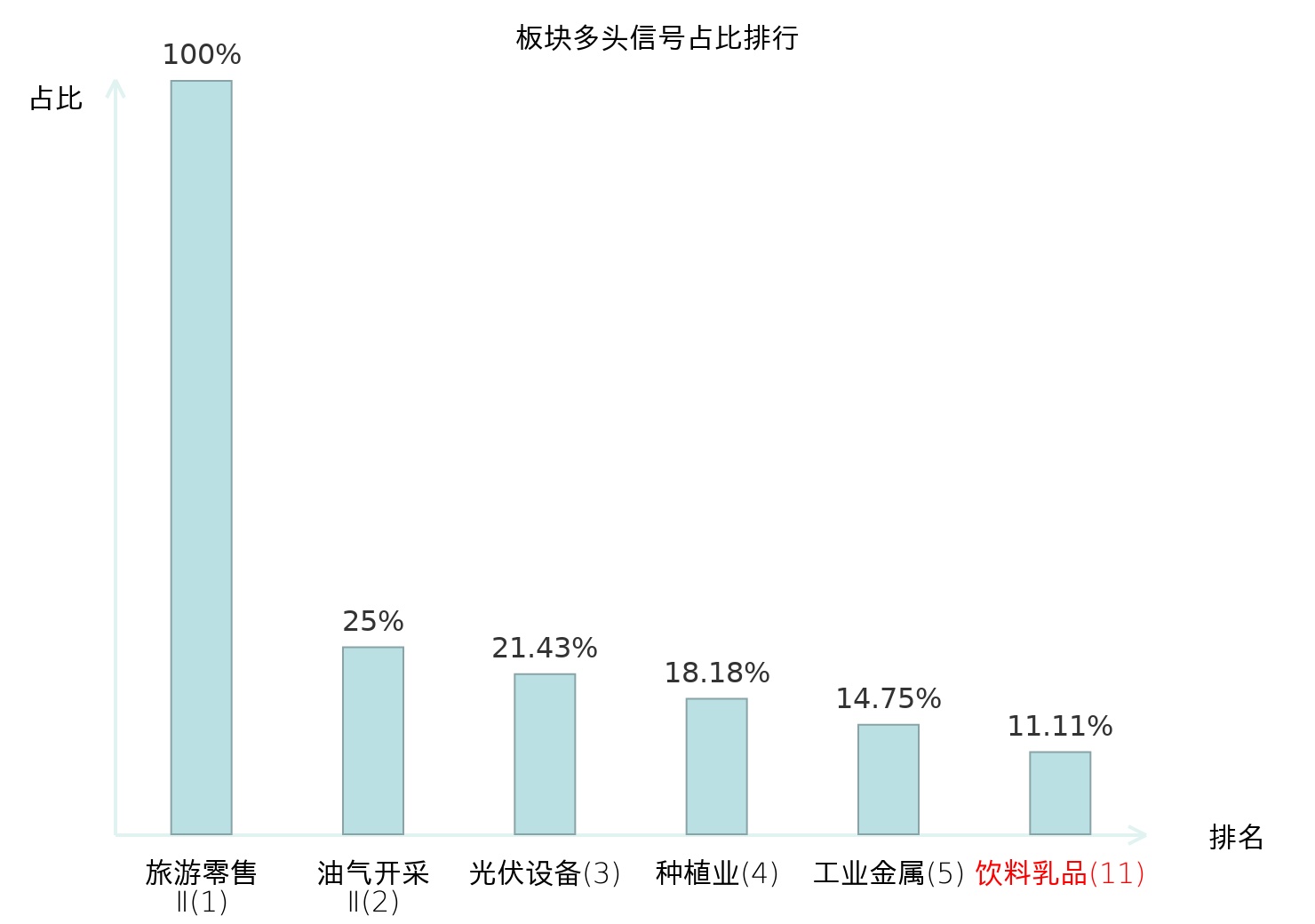 全市场所有行业板块中主力多头信号占比排名中,旅游零售Ⅱ板块位居第一。旅游零售Ⅱ板块名次提升最快,较昨日上升130位。