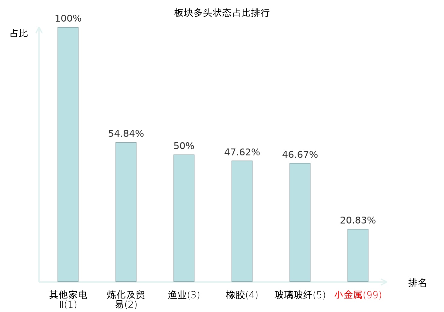 全市场所有行业板块中主力多头状态占比排名中,其他家电Ⅱ板块位居第一。铁路公路板块名次提升最快,较昨日上升37位。