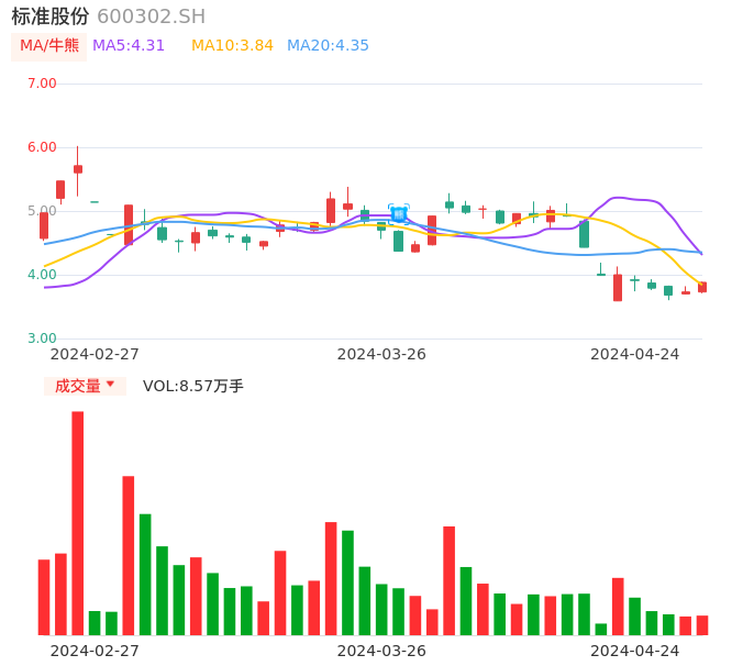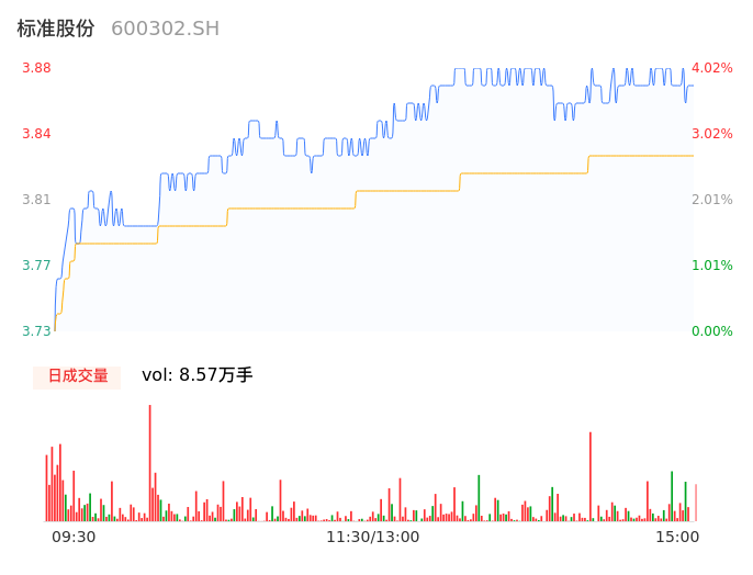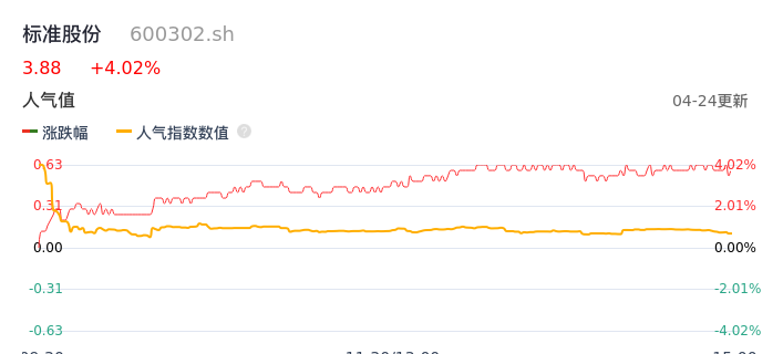 04月24日,标准股份收报3.88,股价涨幅4.02%,成交金额3286.10万元,换手率2.48%。