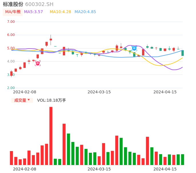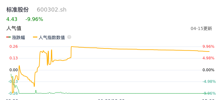 04月15日,标准股份收报4.43,股价涨幅-9.96%,成交金额8197.48万元,换手率5.25%。