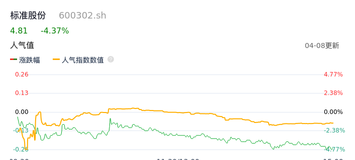 04月08日,标准股份收报4.81,股价涨幅-4.37%,成交金额8910.98万元,换手率5.27%。
