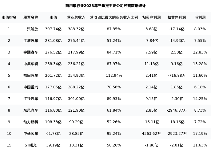 ST曙光最新报告期数据为三季报,下表汇总了商用车行业内市值靠前的公司三季报主要经营数据