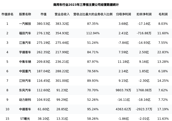 ST曙光最新报告期数据为三季报,下表汇总了商用车行业内市值靠前的公司三季报主要经营数据