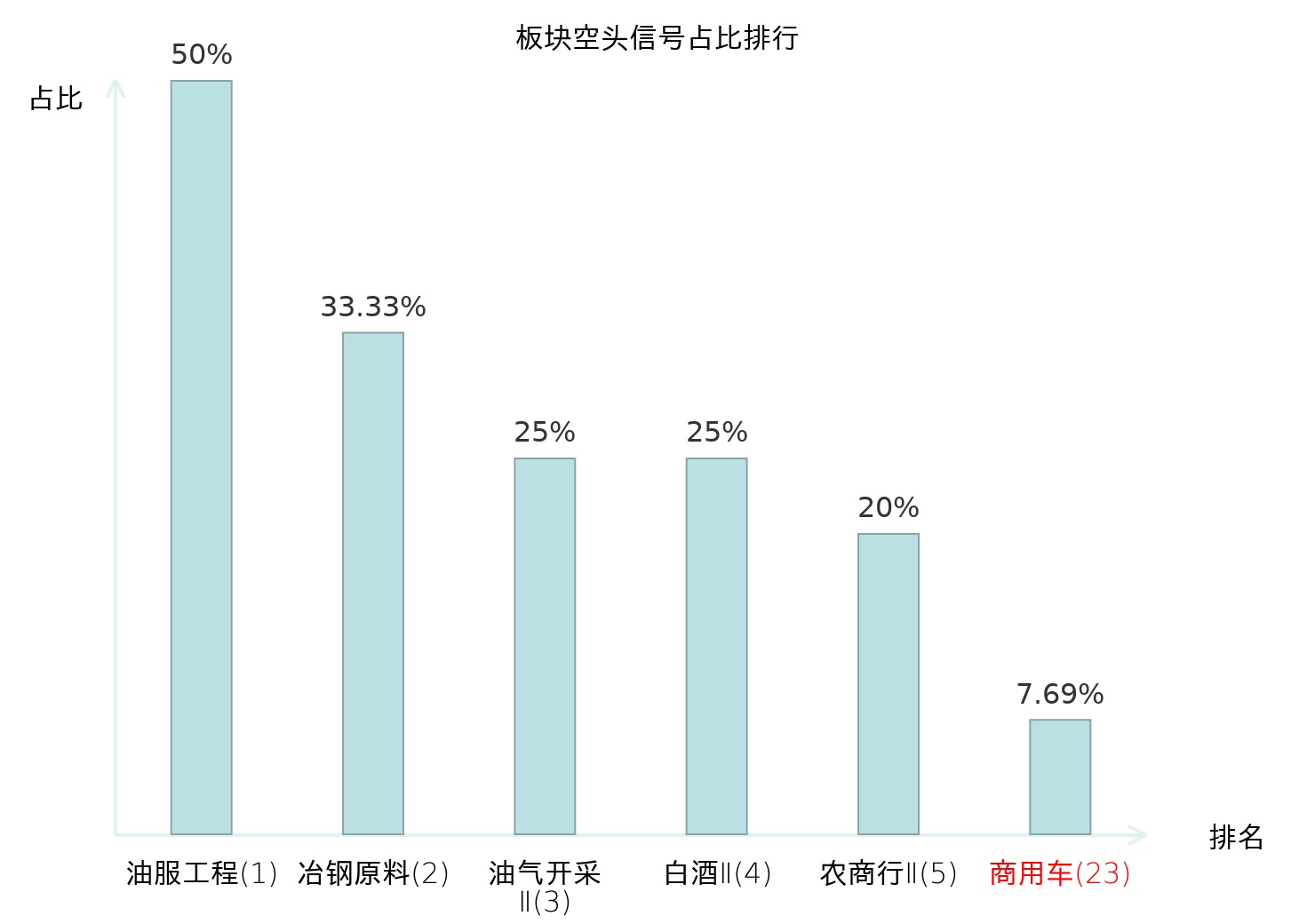 全市场所有行业板块中主力空头信号占比排名中,油服工程板块位居第一。白酒Ⅱ板块名次提升最快,较昨日上升110位。