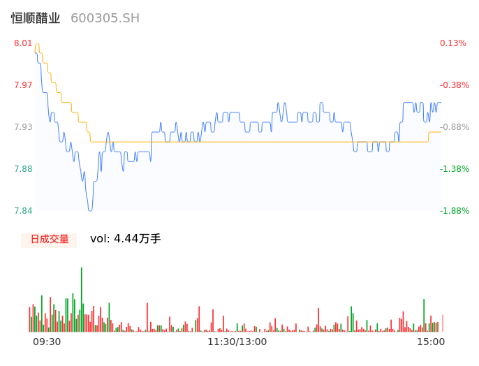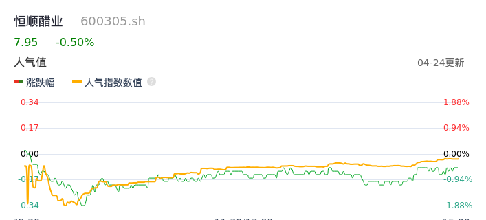 04月24日,恒顺醋业收报7.95,股价涨幅-0.50%,成交金额3512.56万元,换手率0.40%。