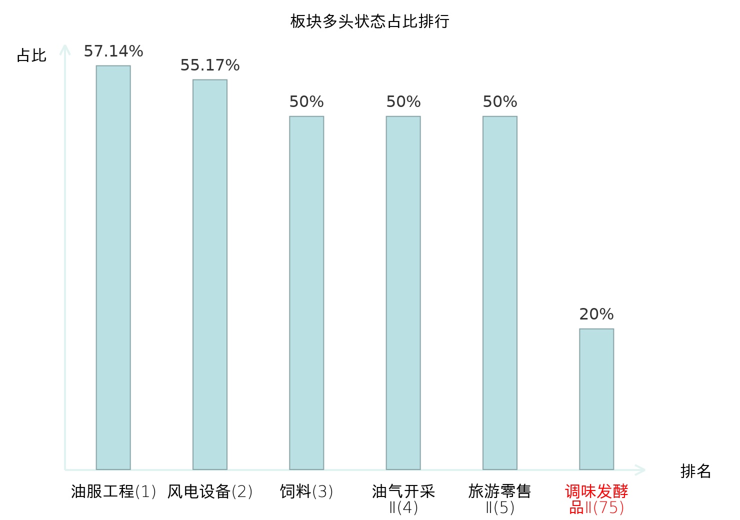 全市场所有行业板块中主力多头状态占比排名中,油服工程板块位居第一。非金属材料Ⅱ板块名次提升最快,较昨日上升67位。