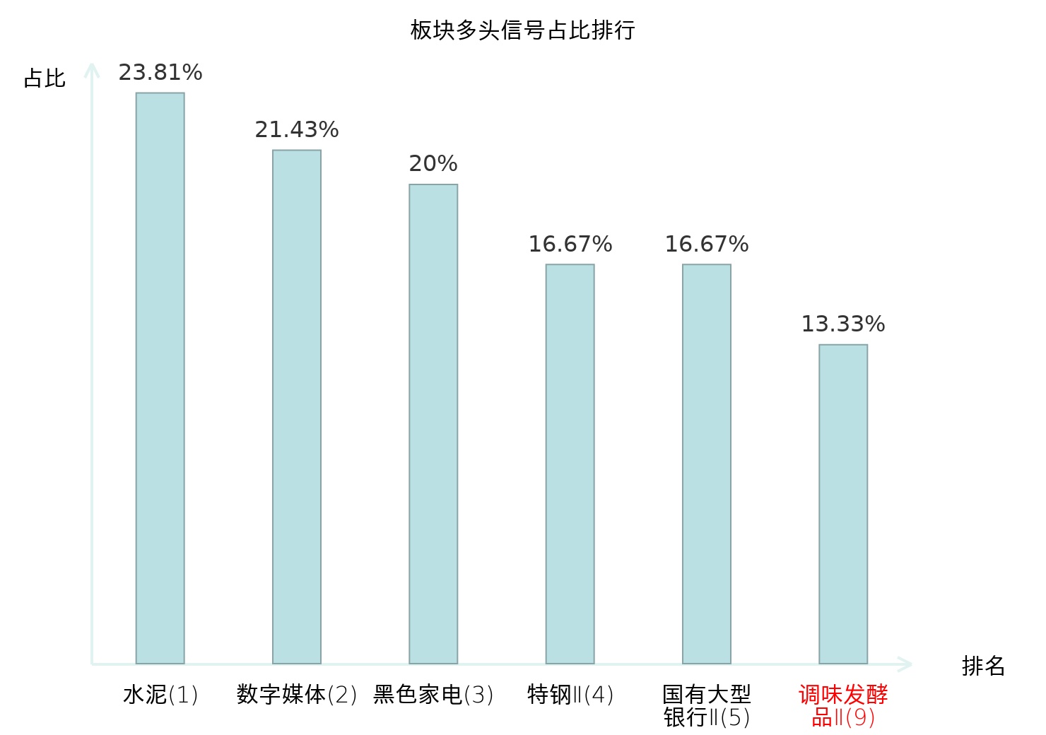 全市场所有行业板块中主力多头信号占比排名中,水泥板块位居第一。焦炭Ⅱ板块名次提升最快,较昨日上升115位。