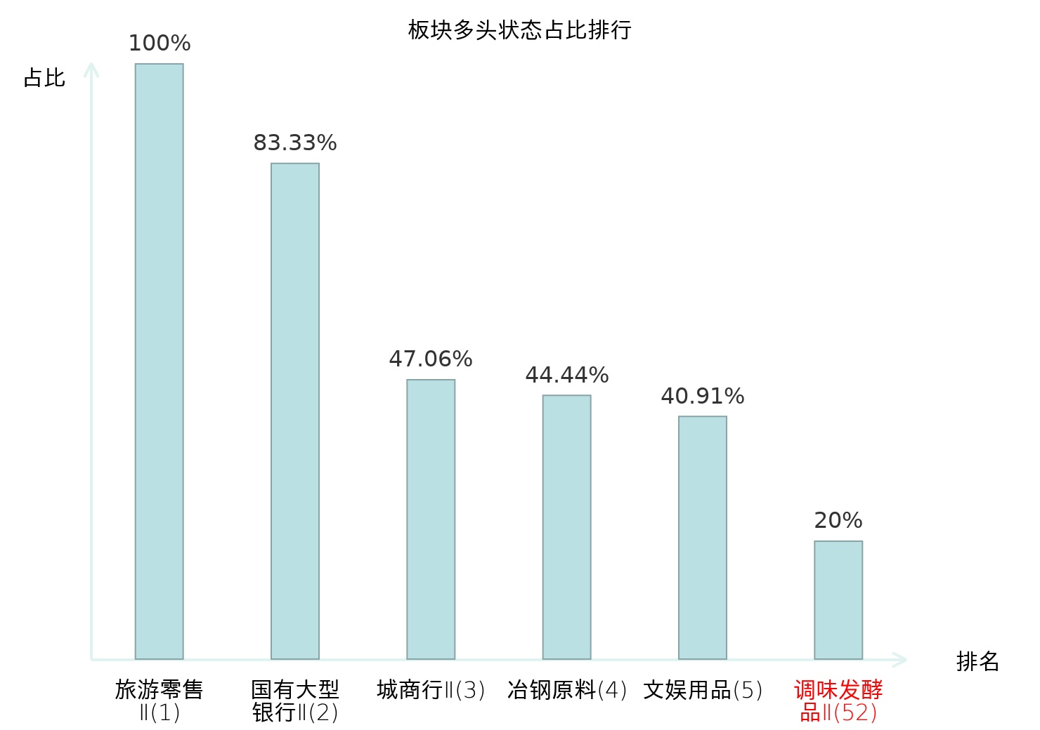 全市场所有行业板块中主力多头状态占比排名中,旅游零售Ⅱ板块位居第一。旅游零售Ⅱ板块名次提升最快,较昨日上升130位。