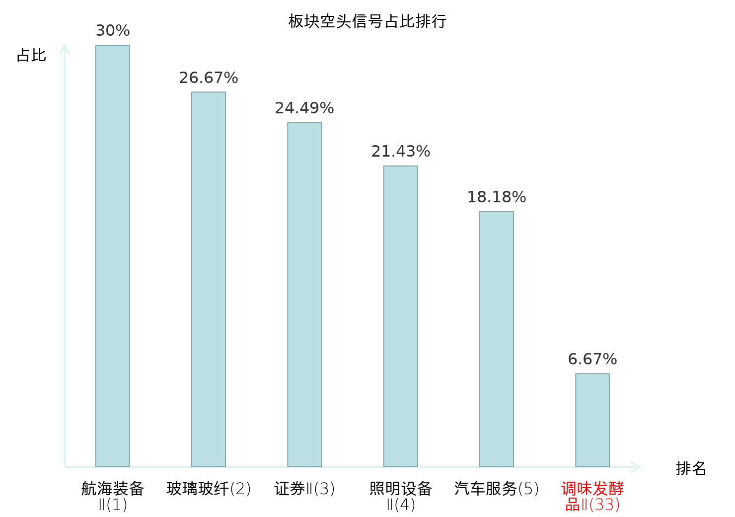 全市场所有行业板块中主力空头信号占比排名中,航海装备Ⅱ板块位居第一。证券Ⅱ板块名次提升最快,较昨日上升125位。