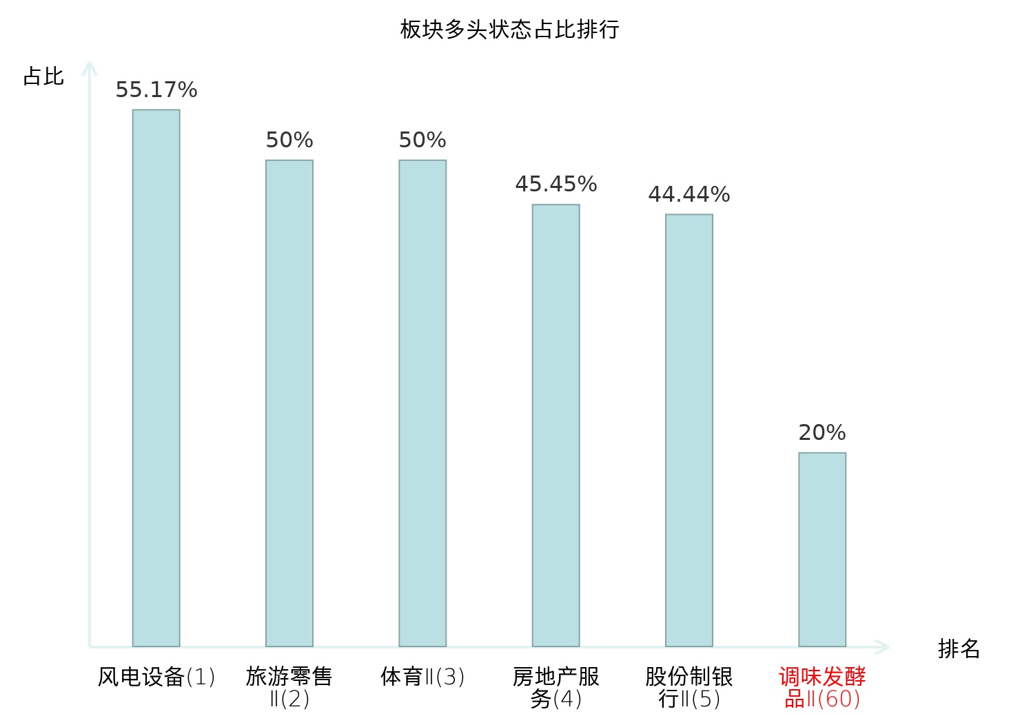全市场所有行业板块中主力多头状态占比排名中,风电设备板块位居第一。保险Ⅱ板块名次提升最快,较昨日上升64位。