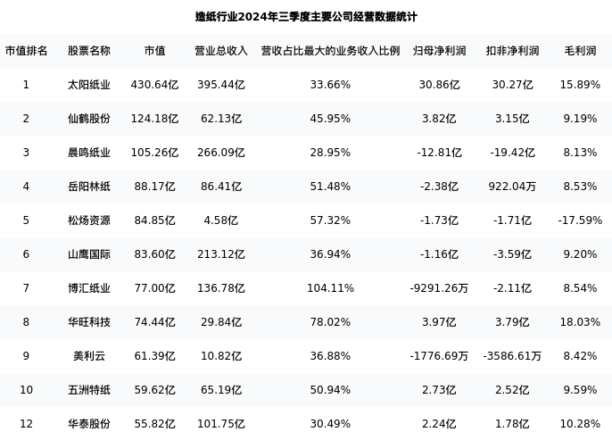 华泰股份最新报告期数据为三季度,下表汇总了造纸行业内市值靠前的公司三季度主要经营数据