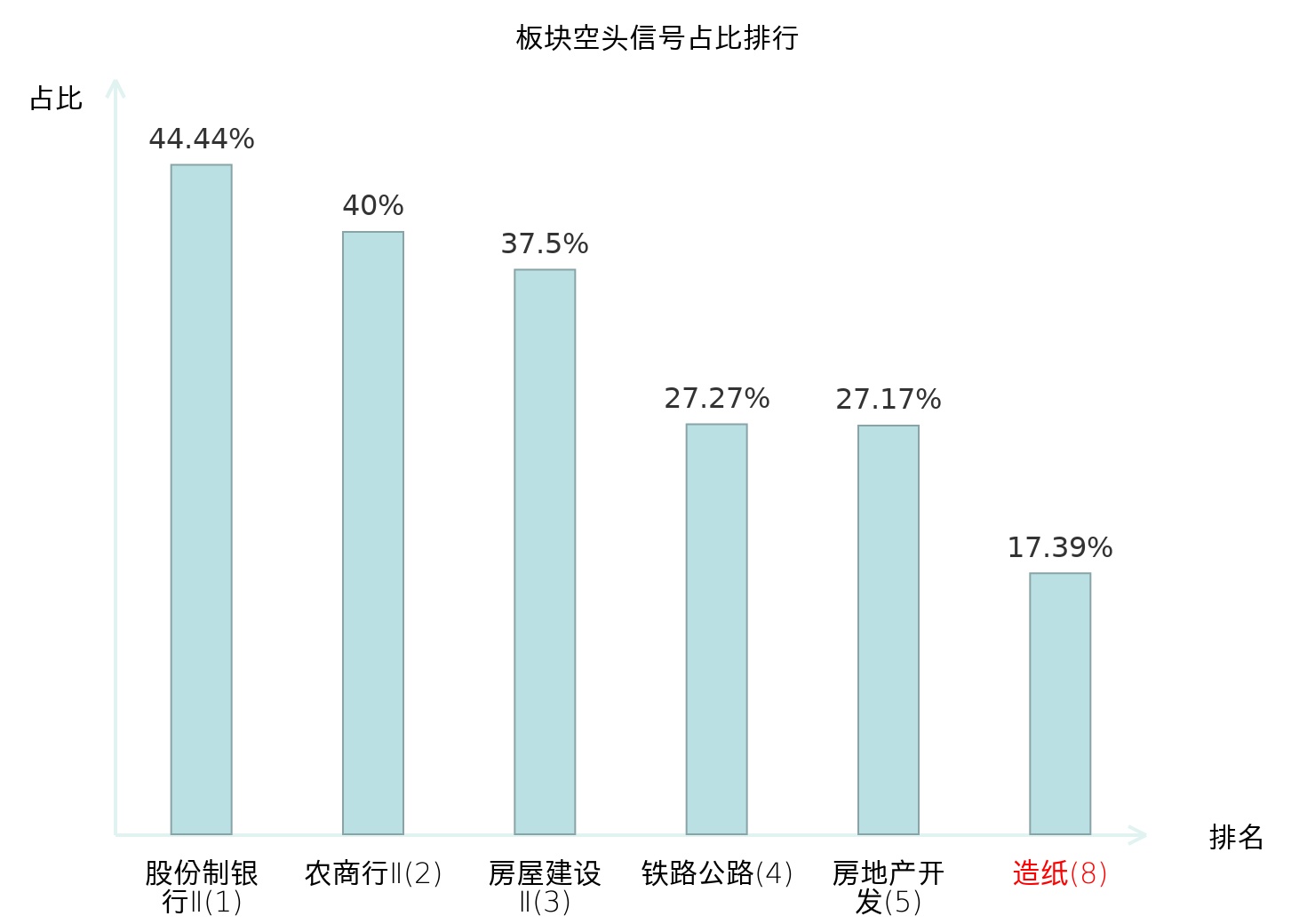 全市场所有行业板块中主力空头信号占比排名中,股份制银行Ⅱ板块位居第一。化学原料板块名次提升最快,较昨日上升118位。