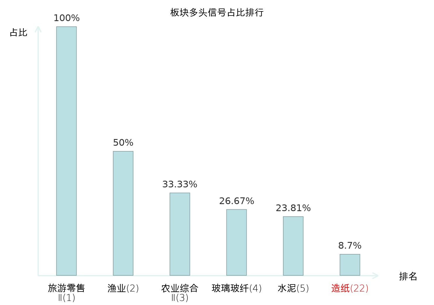 全市场所有行业板块中主力多头信号占比排名中,旅游零售Ⅱ板块位居第一。旅游零售Ⅱ板块名次提升最快,较昨日上升130位。