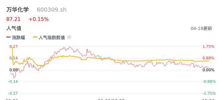 04月18日,万华化学收报87.21,股价涨幅0.15%,成交金额10.36亿元,换手率0.38%。