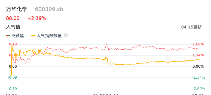 04月15日,万华化学收报88.00,股价涨幅2.19%,成交金额15.24亿元,换手率0.55%。