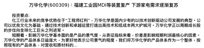 值得注意的是:2024年04月国海证券的李永磊/董伯骏分析师,首次发布关于万华化学的研究报告,标题为:万华化学(600309):福建工业园MDI等装置复产 下游家电需求逐渐复苏。