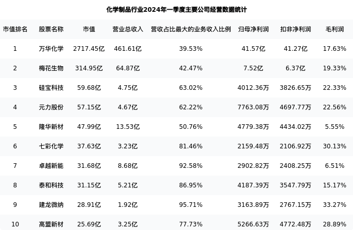 万华化学最新报告期数据为一季度,下表汇总了化学制品行业内市值靠前的公司一季度主要经营数据