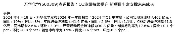 值得注意的是:2024年04月国海证券的李永磊/董伯骏分析师,首次发布关于万华化学的研究报告,标题为:万华化学(600309)点评报告:Q1业绩持续提升 新项目丰富支撑未来成长。