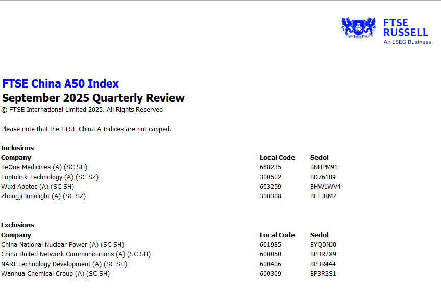 9月3日,国际指数编制公司富时罗素宣布对富时中国50指数、富时中国A50指数、富时中国A150指数、富时中国A200指数、富时中国A400指数的季度审核变更。该变更将于2025年9月19日星期五收盘后(即2025年9月22日星期一)生效。