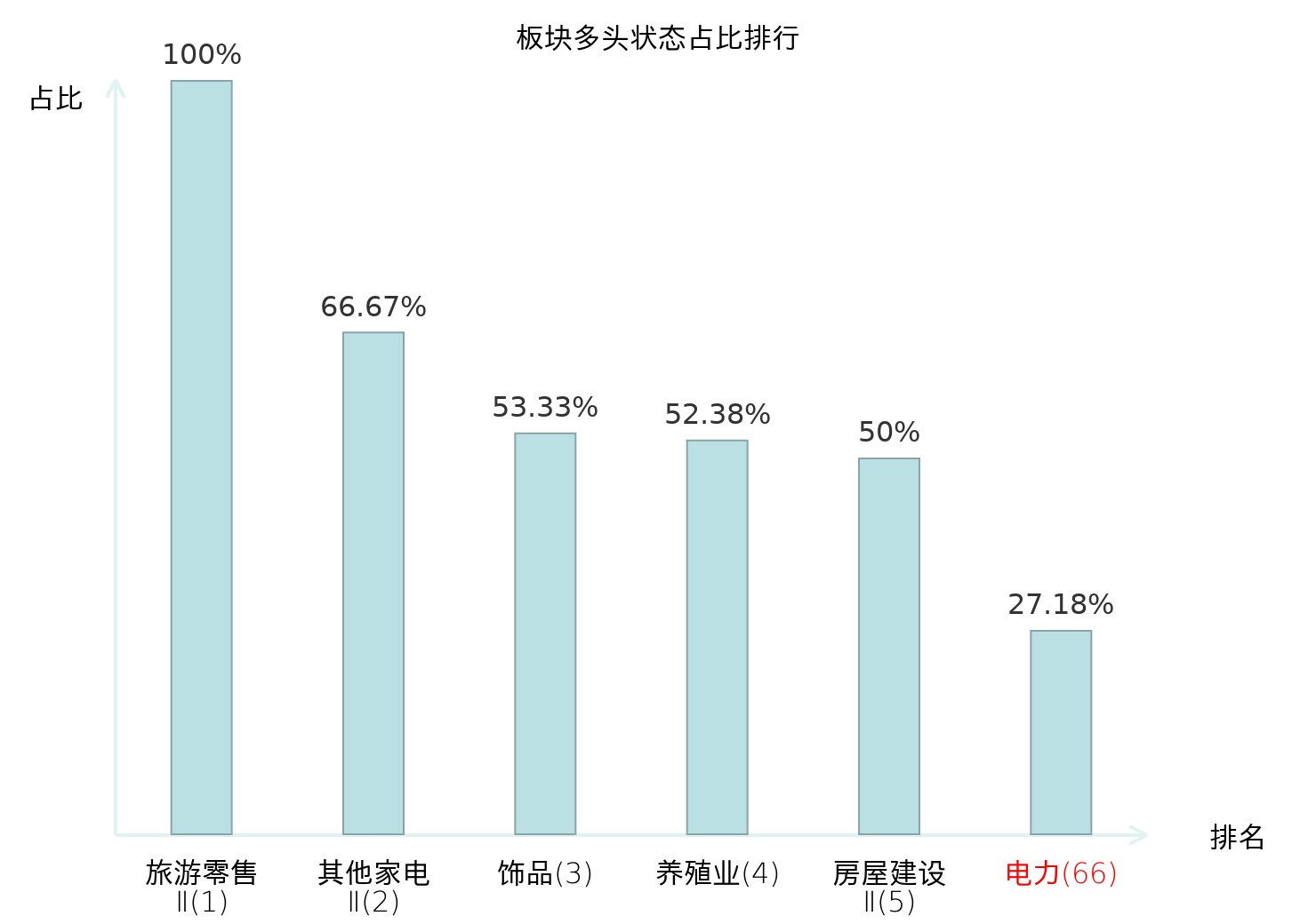 全市场所有行业板块中主力多头状态占比排名中,旅游零售Ⅱ板块位居第一。体育Ⅱ板块名次提升最快,较昨日上升93位。