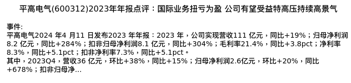 值得注意的是:2024年04月国海证券的李航/王刚分析师,首次发布关于平高电气的研究报告,标题为:平高电气(600312)2023年年报点评:国际业务扭亏为盈 公司有望受益特高压持续高景气。