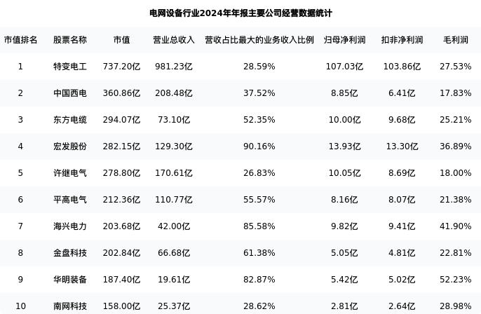 平高电气最新报告期数据为年报,下表汇总了电网设备行业内市值靠前的公司年报主要经营数据
