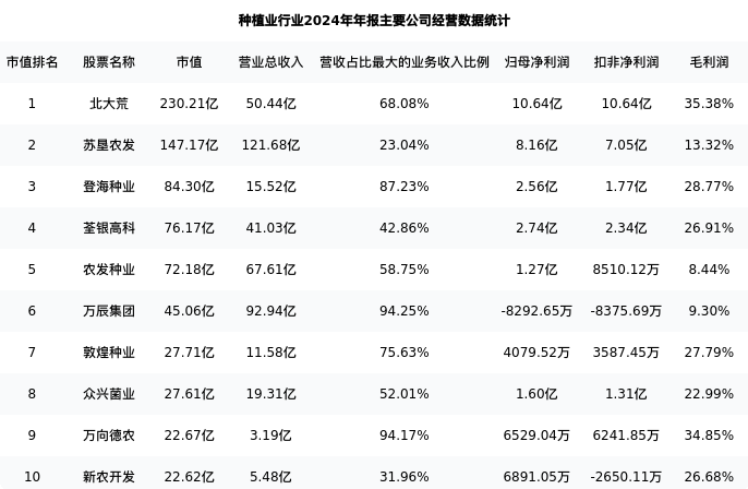 农发种业最新报告期数据为年报,下表汇总了种植业行业内市值靠前的公司年报主要经营数据
