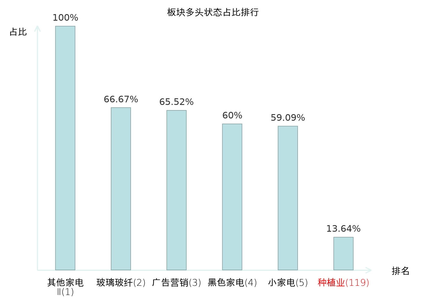 全市场所有行业板块中主力多头状态占比排名中,其他家电Ⅱ板块位居第一。航天装备Ⅱ板块名次提升最快,较昨日上升79位。