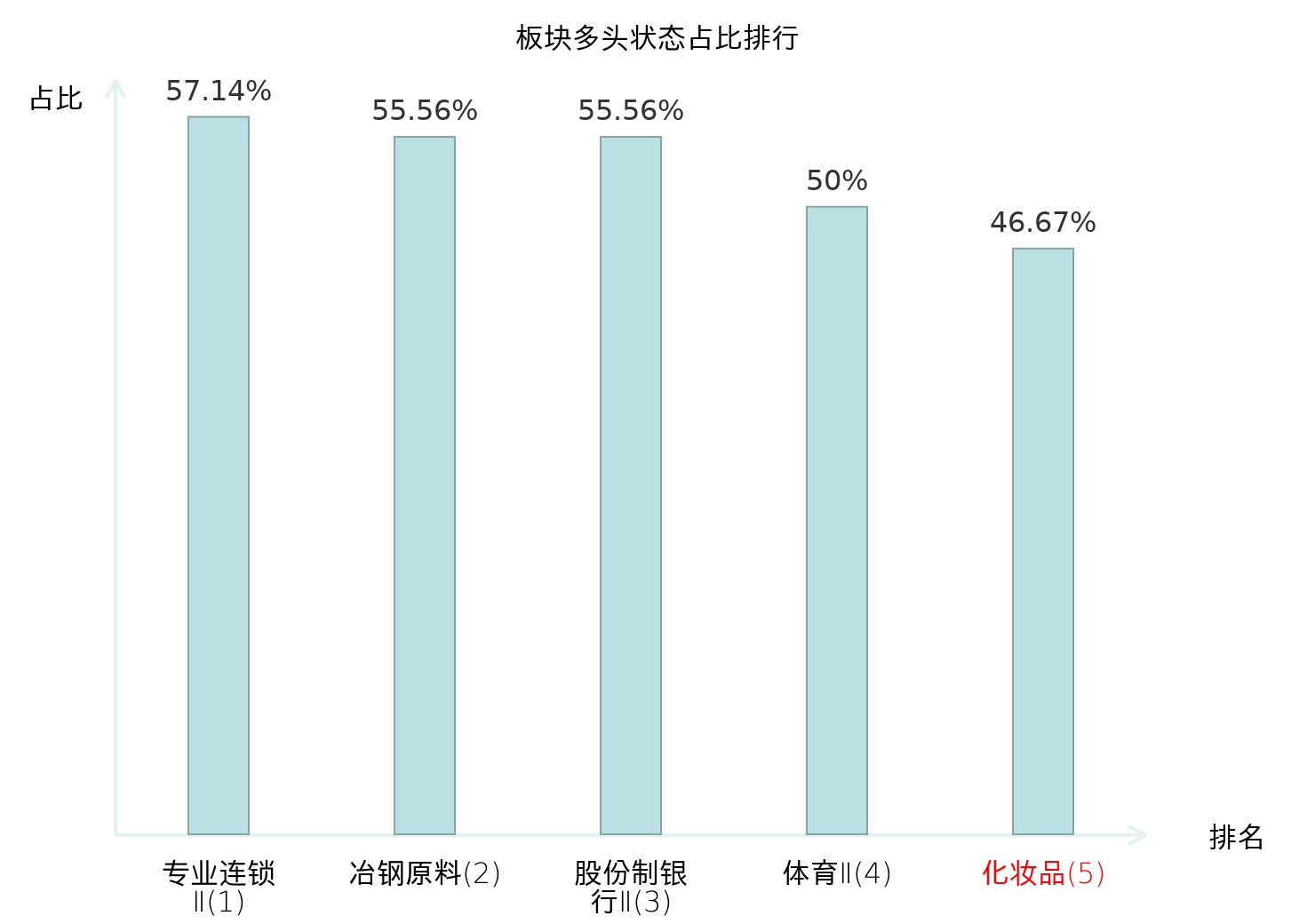 全市场所有行业板块中主力多头状态占比排名中,专业连锁Ⅱ板块位居第一。乘用车板块名次提升最快,较昨日上升85位。