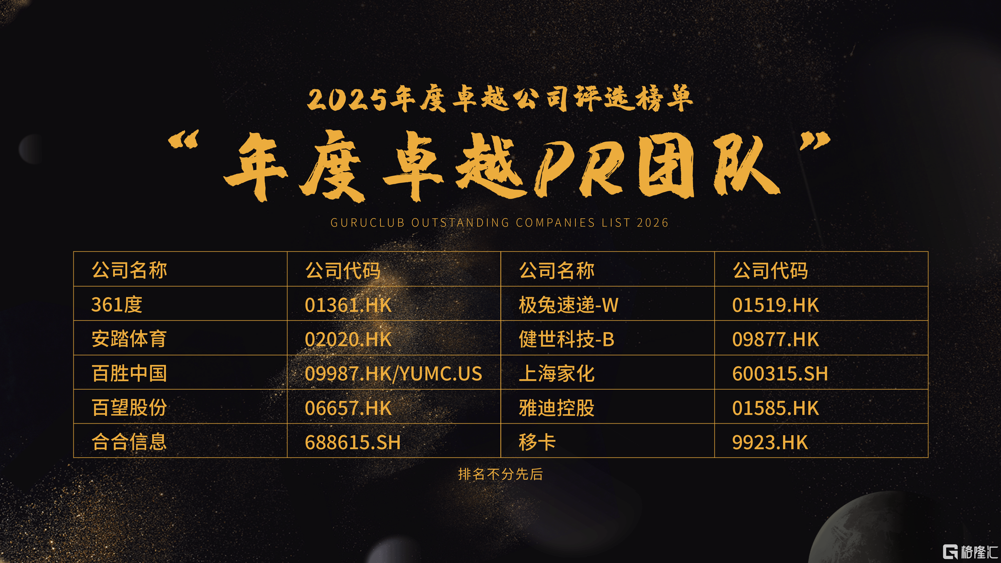 12月22日,格隆汇在线上举办"科技赋能·资本破局"分享会。本次分享会,备受瞩目的卓越公司评选榜单将隆重揭晓,其中格隆汇“金格奖”年度卓越公司评选中,361度(01361.HK)、安踏体育(02020.HK)、百胜中国(09987.HK/YUMC.US)、百望股份(06657.HK)、合合信息(688615.SH)、极兔速递-W(01519.HK)、健世科技-B(09877.HK)、上海家化(600315.SH)、雅迪控股(01585.HK)、移卡(09923.HK) 10家企业荣获“年度卓越PR团队”奖项。(排名不分先后,按公司首部字母顺序排列)