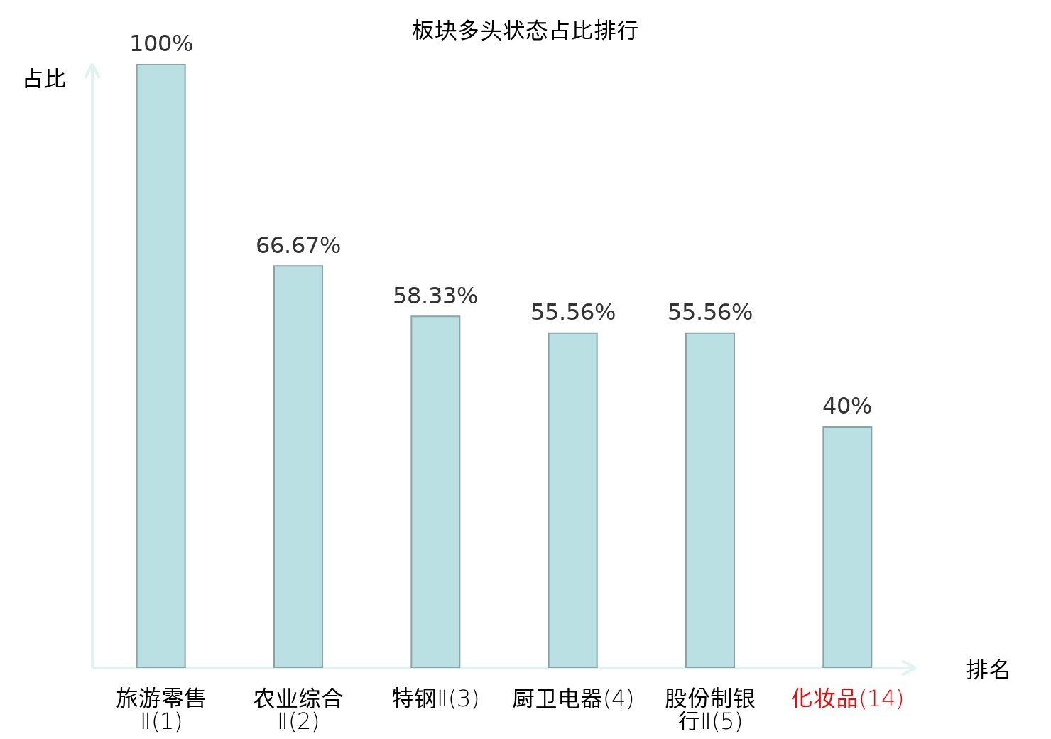 全市场所有行业板块中主力多头状态占比排名中,旅游零售Ⅱ板块位居第一。农业综合Ⅱ板块名次提升最快,较昨日上升127位。