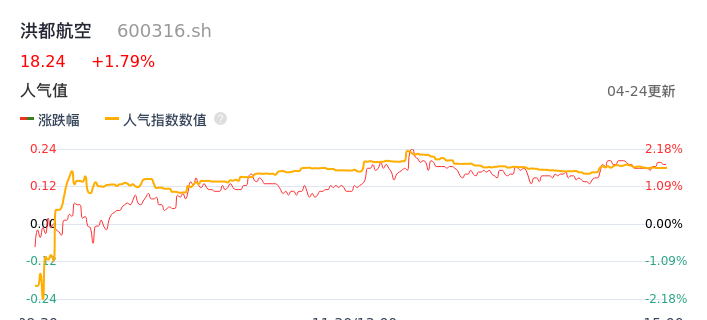 04月24日,洪都航空收报18.24,股价涨幅1.79%,成交金额1.45亿元,换手率1.11%。