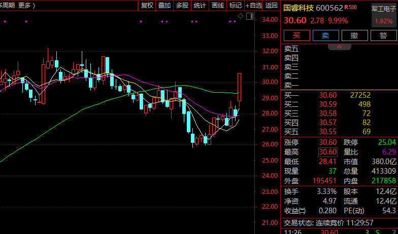 经过多日调整后,国防军工股再度走强,军贸概念领涨,板块指数高开高走,盘中一度放量大涨逾3%。国睿科技(600562)开盘仅约10分钟就直线拉涨停,不到6分钟成交超昨日全天成交,航天南湖、广东宏大、中航沈飞、中航成飞等涨幅居前。