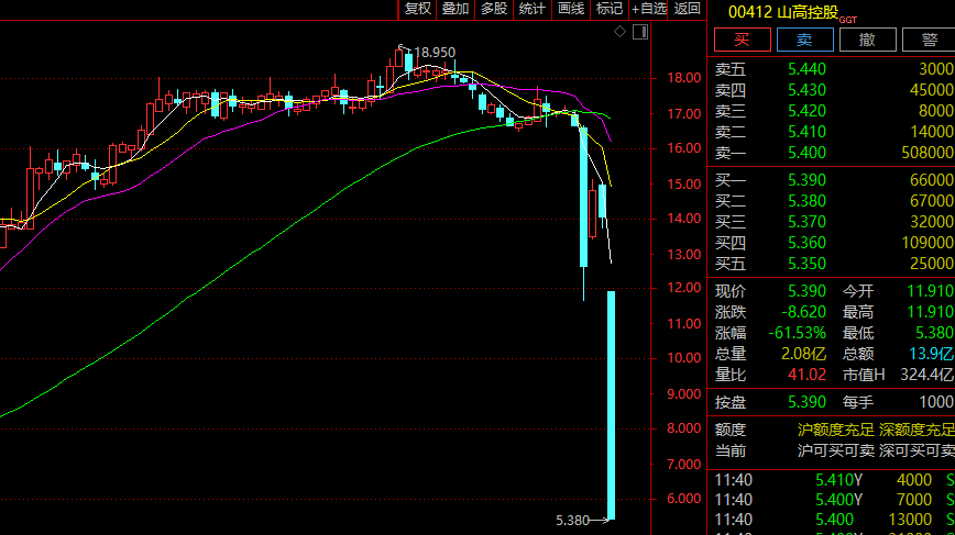 港股山高控股今日大幅低开低走,截至发稿,重挫逾60%,报5.6港元,创4个月来新低。8月底,山高控股还一度触及18.95港元,不到1个月的时间大跌逾70%。