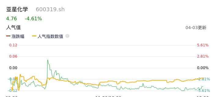 04月03日,亚星化学收报4.76,股价涨幅-4.61%,成交金额1.40亿元,换手率9.21%。
