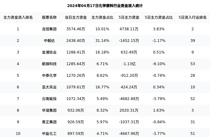 从主力资金流向来看,化学原料行业今日主力资金流入19.50亿元,在所有申万二级行业中排名:43/131。