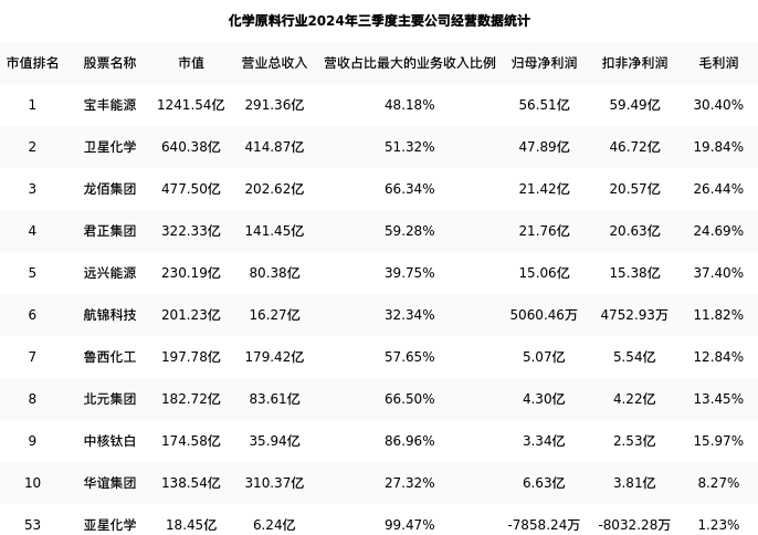 亚星化学最新报告期数据为三季度,下表汇总了化学原料行业内市值靠前的公司三季度主要经营数据