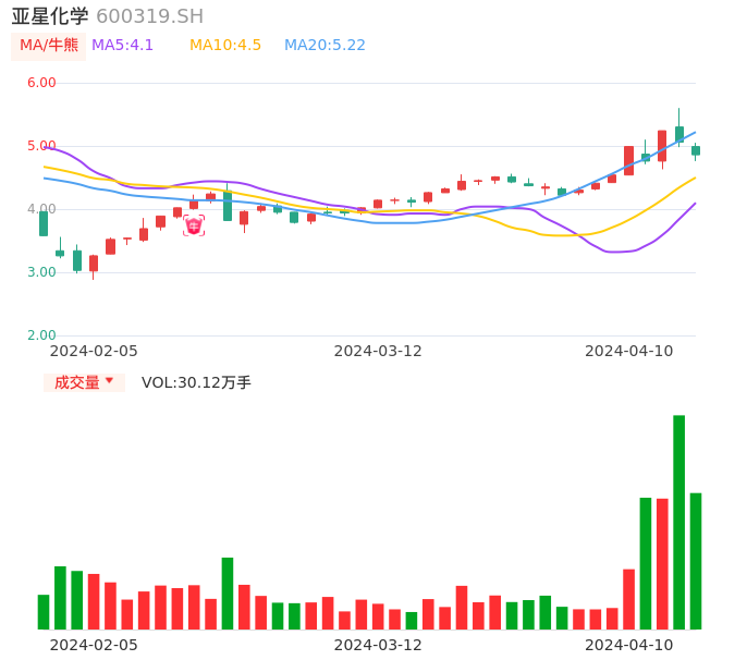 04月10日,亚星化学收报4.86,股价涨幅-3.95%,成交金额1.46亿元,换手率9.54%。