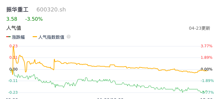 04月23日,振华重工收报3.58,股价涨幅-3.50%,成交金额1.66亿元,换手率1.38%。