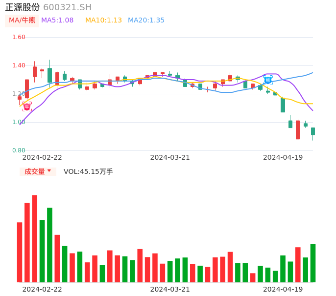 04月19日,正源股份收报0.91,股价涨幅-6.19%,成交金额4133.75万元,换手率2.99%。