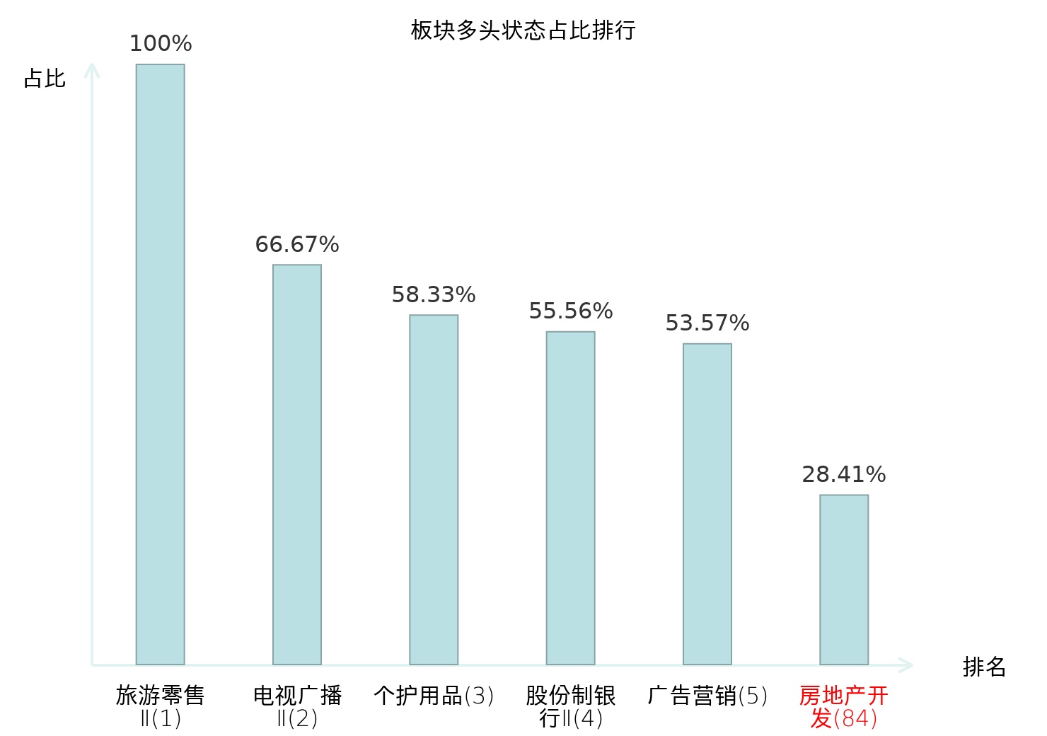 全市场所有行业板块中主力多头状态占比排名中,旅游零售Ⅱ板块位居第一。国有大型银行Ⅱ板块名次提升最快,较昨日上升106位。