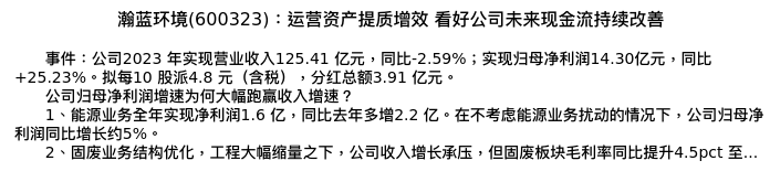值得注意的是:2024年04月天风证券的郭丽丽分析师,首次发布关于瀚蓝环境的研究报告,标题为:瀚蓝环境(600323):运营资产提质增效 看好公司未来现金流持续改善。