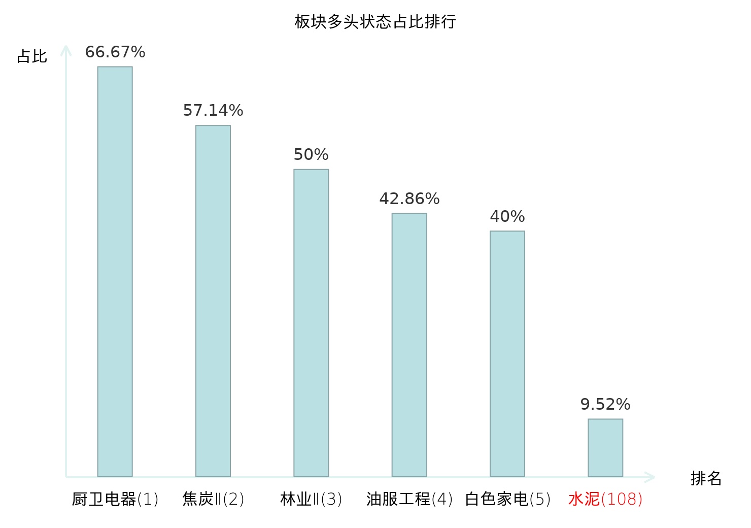 全市场所有行业板块中主力多头状态占比排名中,厨卫电器板块位居第一。风电设备板块名次提升最快,较昨日上升98位。