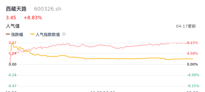 04月17日,西藏天路收报3.45,股价涨幅8.83%,成交金额1.18亿元,换手率2.84%。