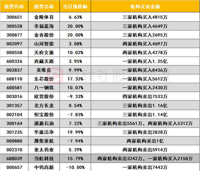 今日龙虎榜机构活跃度较高,买入方面,影视股幸福蓝海获机构买入超4000万;超级水电概念股西藏天路获机构买入1.25亿;液冷服务器概念股英维克获机构买入超8000万。
