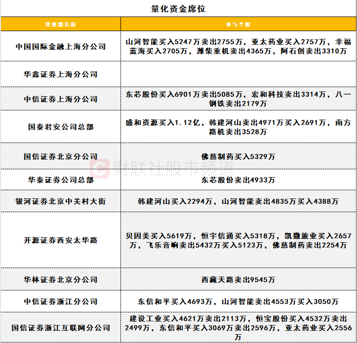 量化资金活跃度一般,盛和资源获一家量化席位买入1.12亿;西藏天路遭一家量化席位卖出超9000万。