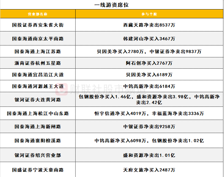 一线游资活跃度有所回升,银河证券大连黄河路超亿元买卖多只周期股,其中盛和资源净卖出3.98亿,包钢股份净买入1.46亿;中银证券遭两家一线游资席位合计卖出超1.9亿;婴童概念股贝因美获两家一线游资席位买入。