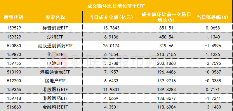 从成交额环比增长前十的ETF来看,前两位均为跨境ETF,其中标普消费ETF(159529)成交额环比增长851%位居首位。