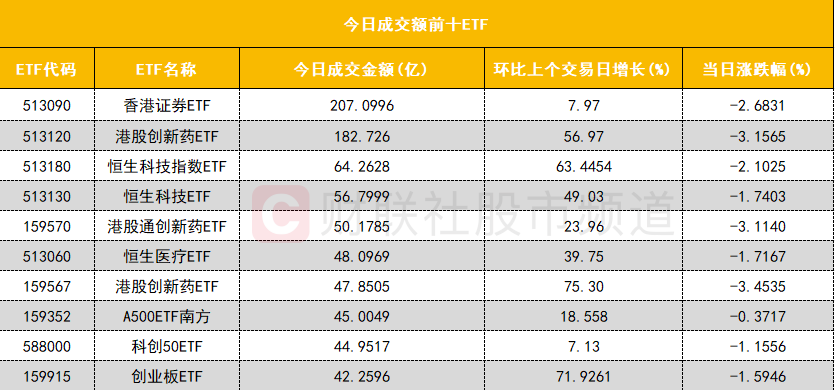 从成交额前十的ETF来看,香港证券ETF(513090)成交额位居首位,港股创新药ETF(513120)成交额位居次席。
