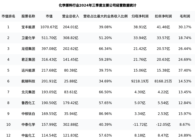 中盐化工最新报告期数据为三季度,下表汇总了化学原料行业内市值靠前的公司三季度主要经营数据